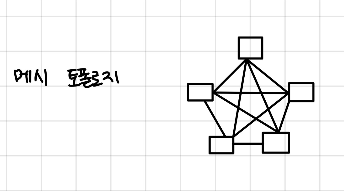 - 그물망처럼 노드 간 완전히 연결되어 있는 구조