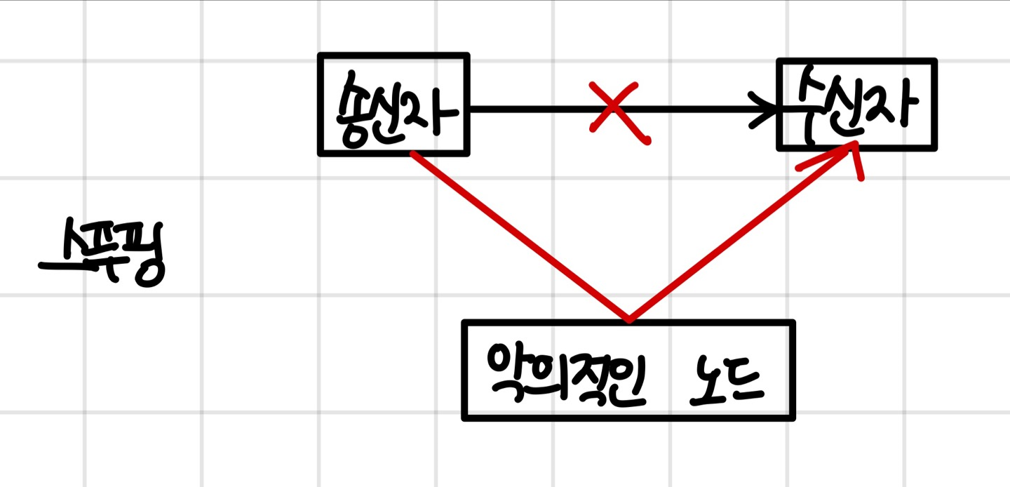 - 스푸핑을 적용하면 수신부로 가야할 패킷이 악의적인 노드에게 전달됨
