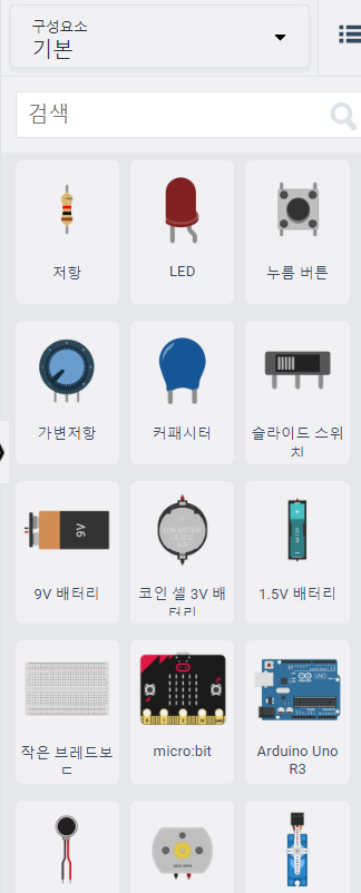 오른쪽 탭에 아두이노 우노 R3를 포함하여 다양한 구성요소들이 존재합니다.