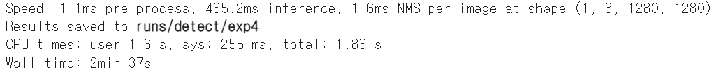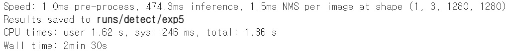 10초 mp4 영상을 yolov5 모델로 돌렸더니 아래와 같은 성능을 보였으며, 결과적으로 총 2min 57s가 걸렸습니다.