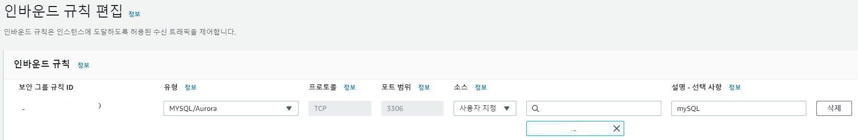 이때, 소스의 경우에는 현재 보안 그룹으로 선택해주었고 설명은 생략 가능하다.