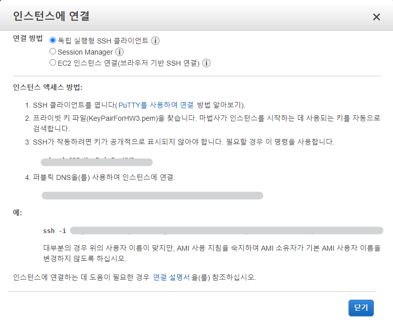 EC2 콘솔로 돌아와서 만들었던 인스턴스를 연결한다.