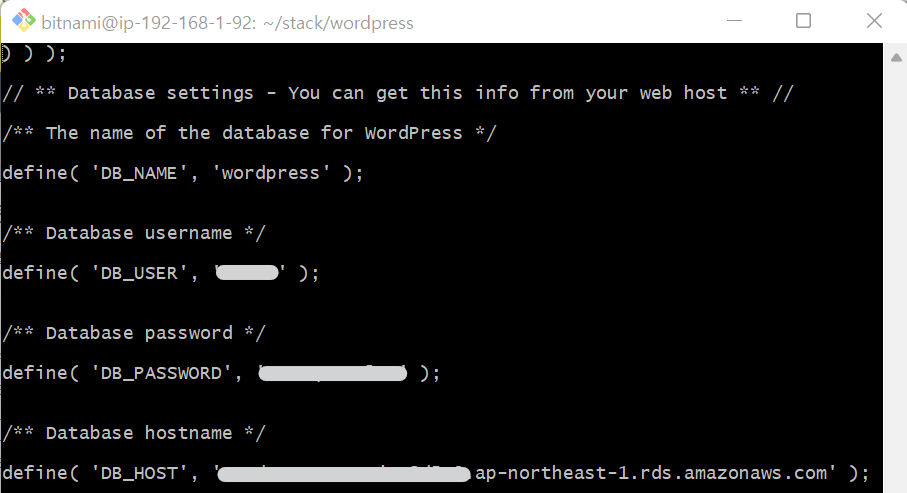 여기서 cd 명령어를 사용해서 /home/bitnami/stack/wordpress 경로로 이동해주면 wp-config.php 파일이 있는 것을 볼 수 있다. vim 명령어로 이 파일을 수정해줘야 한다.