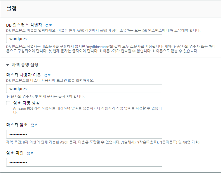 다음과 같이 DB 인스턴스 식별자, 마스터 사용자 이름, 마스터 암호를 입력했다. 이 세가지는 나중을 위해 기억해두어야 한다.