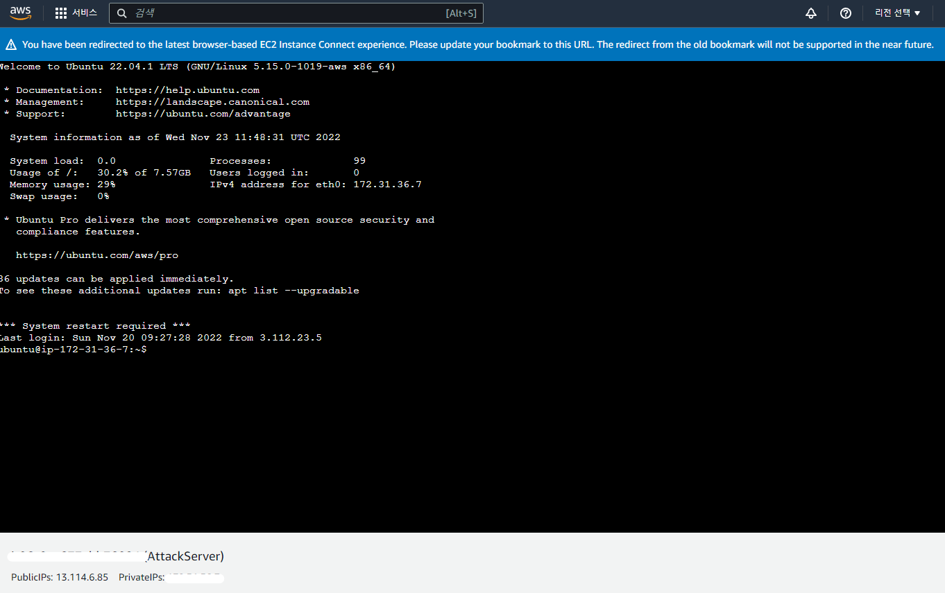 이 DNS를 이용하여 Attack server 인스턴스 콘솔에 다음과 같이 명령어를 입력한다.