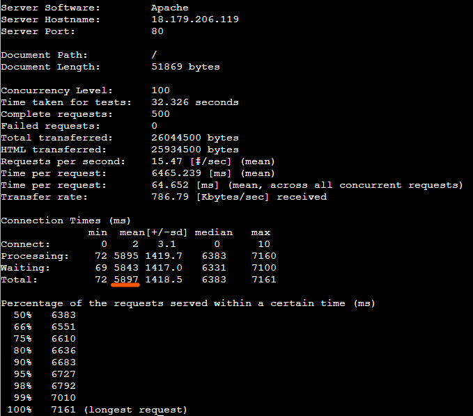 위 사진의 밑줄 친 부분은 평균 connection time을 의미하며, 그 값이 5897ms임을 확인할 수 있다.