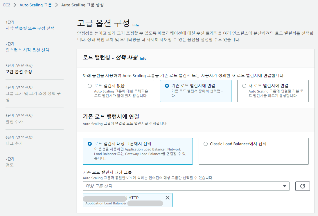 고급 옵션 구성에서는 다음과 같이 "기존 로드 밸런서에 연결"을 선택하였고, 앞서 생성한 대상 그룹을 선택해주었다.