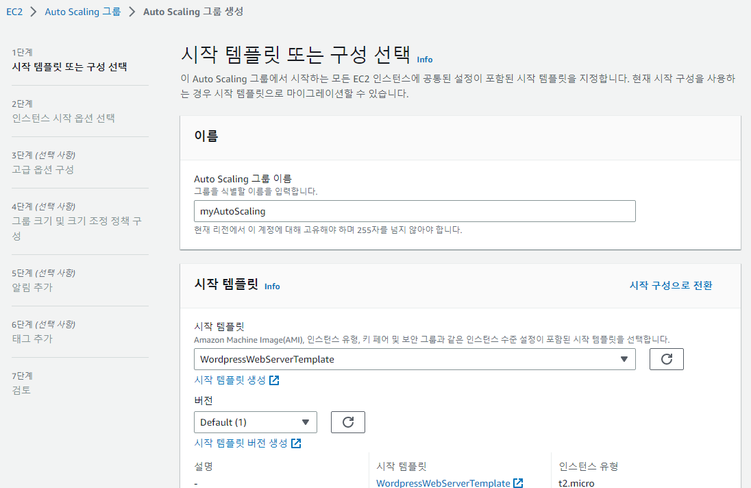 Auto Scaling 그룹 이름을 입력해주고, 시작 템플릿으로 저번 게시글에서 생성한 시작 템플릿을 선택해주었다.