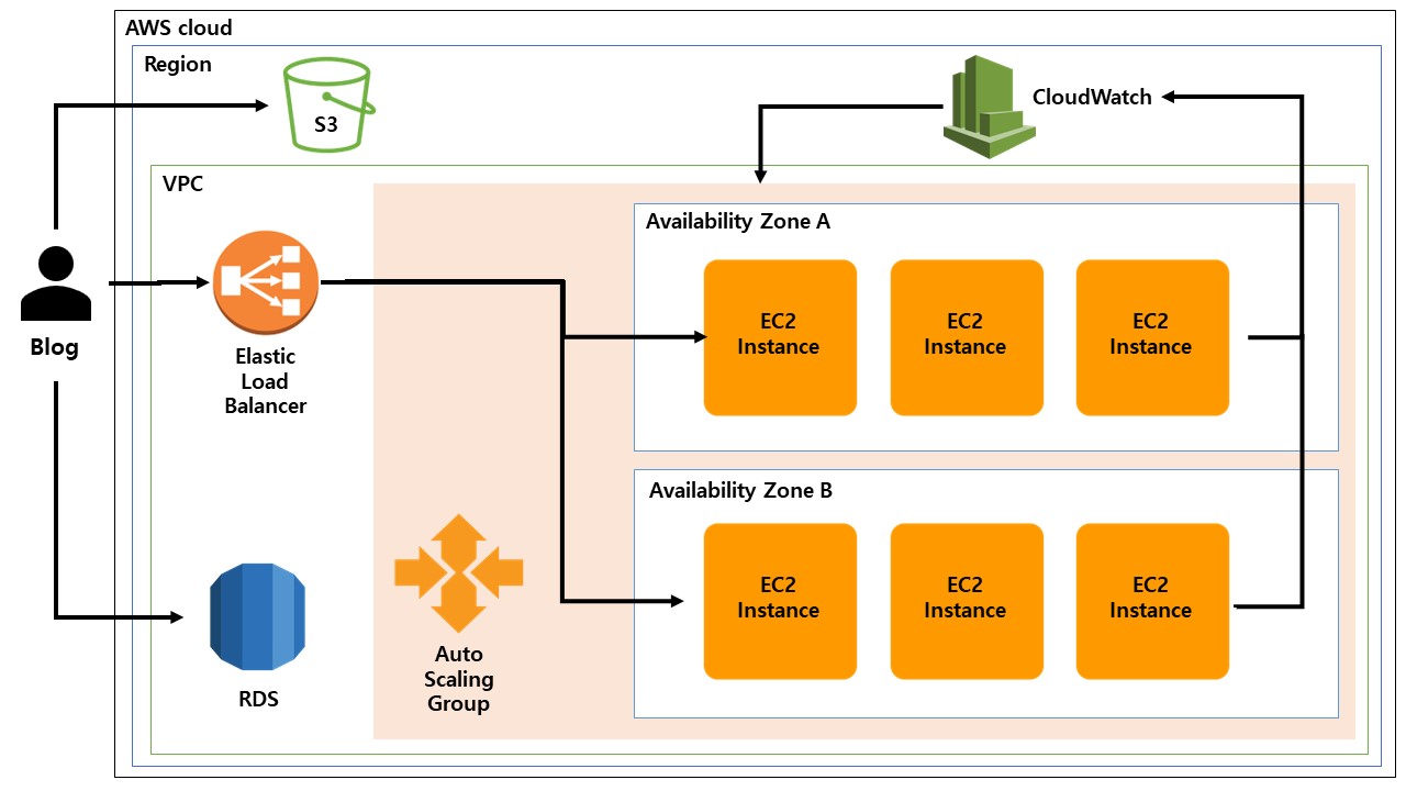 - 사용자가 blog에 글을 게시하면 그에 관한 data가 RDS의 database에 저장되고, 이미지는 S3 bucket에 저장된다. 서로 다른 wordpress 인스턴스가 같은 RDS database와 S3 bucket을 공유하기 때문에, 실시간으로 블로그 내용이 동기화된다.