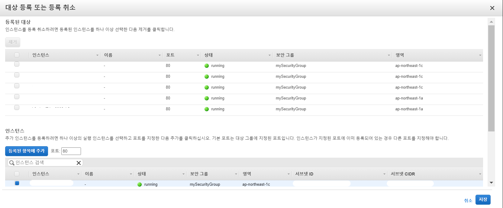 아래 인스턴스 목록에서 원하는 인스턴스를 체크 후 "등록된 항목에 추가" 버튼을 누르면 "등록된 대상"에 해당 인스턴스가 추가됨을 볼 수 있다.