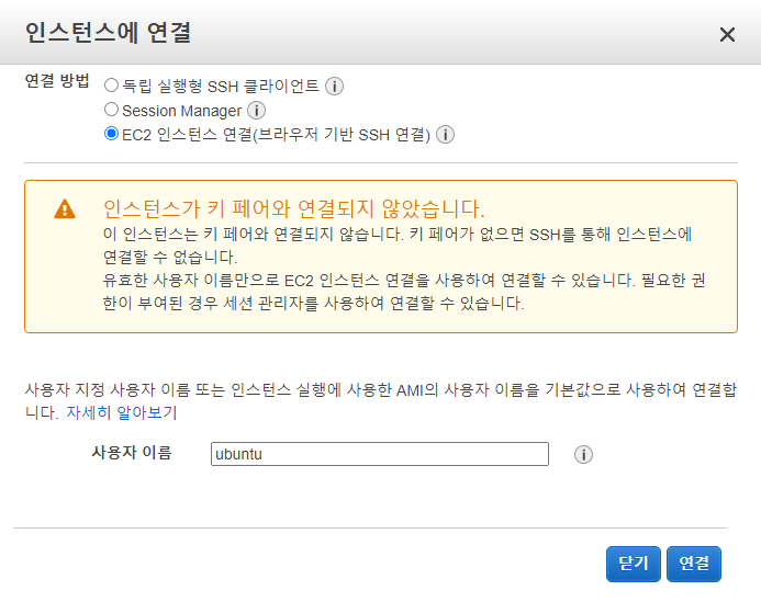 이번에는 브라우저 기반 SSH 연결 방법을 통해 인스턴스를 연결하였다.