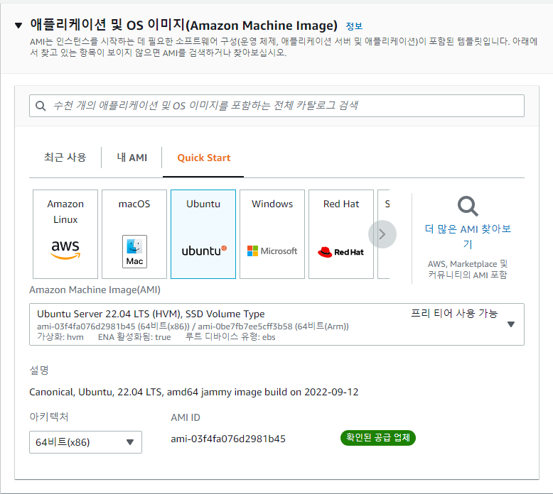 이때, 애플리케이션 및 OS 이미지(Amazon Machine Image)로는 Ubuntu를 선택하겠다.