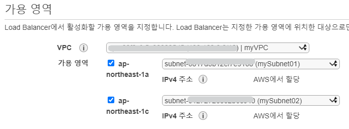 로드 밸런서 이름을 입력하고, 가용 영역은 다음과 같이 wordpress 인스턴스가 속한 VPC와, 그에 속한 모든 subnet으로 설정해주었다.