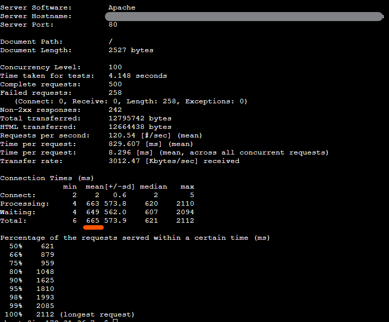 이 명령어는 500개의 요청이 서비스될 때까지 100개의 요청을 동시에 wordpress 서버에게 보내겠다는 의미이다.