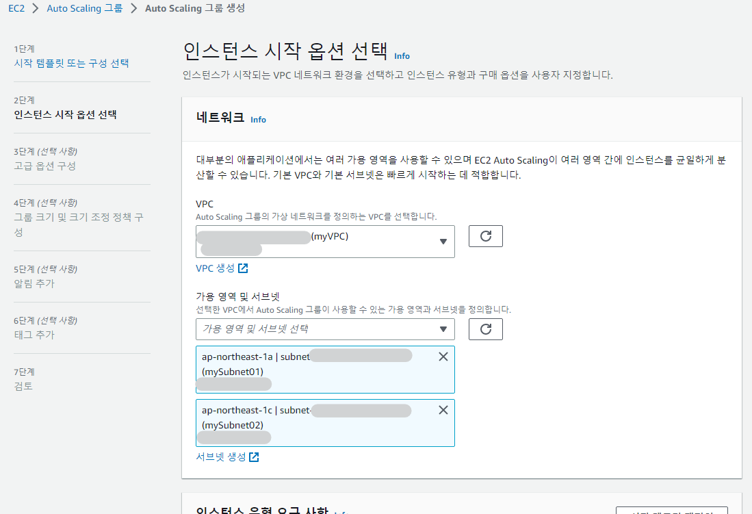 인스턴스 시작 옵션 선택에서는 다음과 같이 wordpress 인스턴스가 속한 vpc를 선택해주었고, 가용 영역 및 서브넷으로는 해당 vpc에 속한 모든 서브넷을 선택하였다.