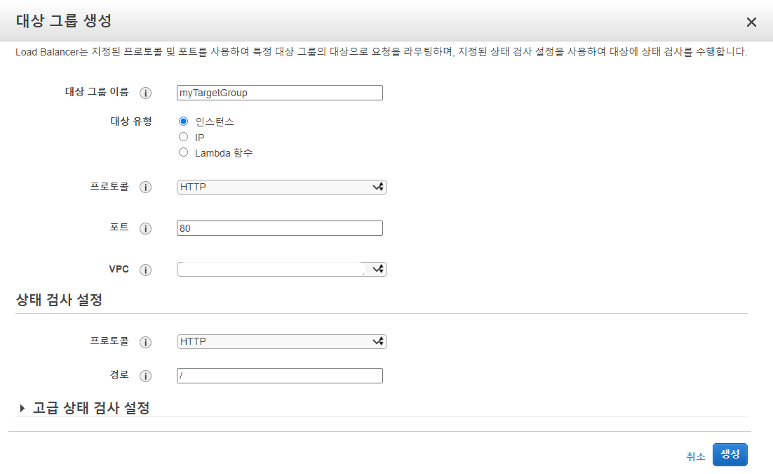 다음과 같이 대상 그룹 이름을 입력하고, 대상 유형은 인스턴스로, VPC는 wordpress 인스턴스와 같은 VPC로 설정해주었다.