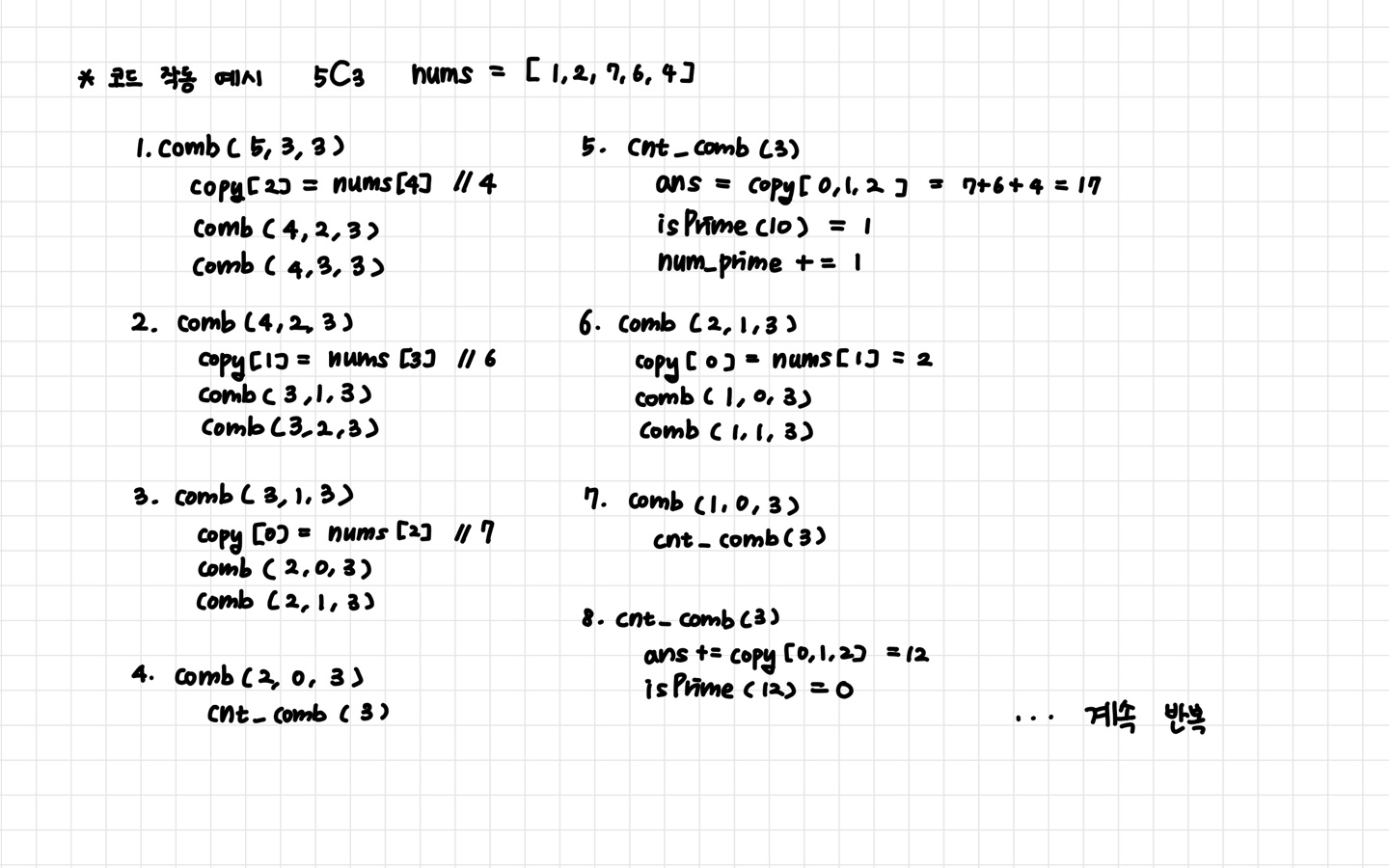 주어진 nums 배열에서 세 가지 원소를 합하여 만들 수 있는 모든 수를 구하고, 해당 수가 소수인지 판별하여 소수라면 num_prime을 1씩 증가시키는 방식으로 구현하였다.