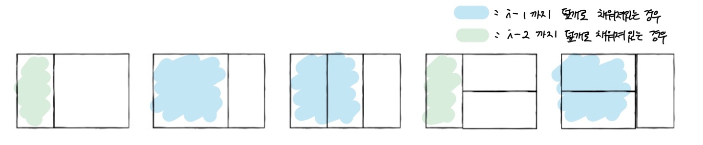 - 왼쪽부터 차례대로 바닥을 덮개로 채운다고 생각하면 다음과 같은 점화식을 세울 수 있음