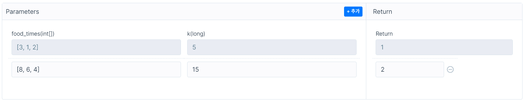 # 시간이 작은 음식부터 빼야 하므로 우선순위 큐 이용